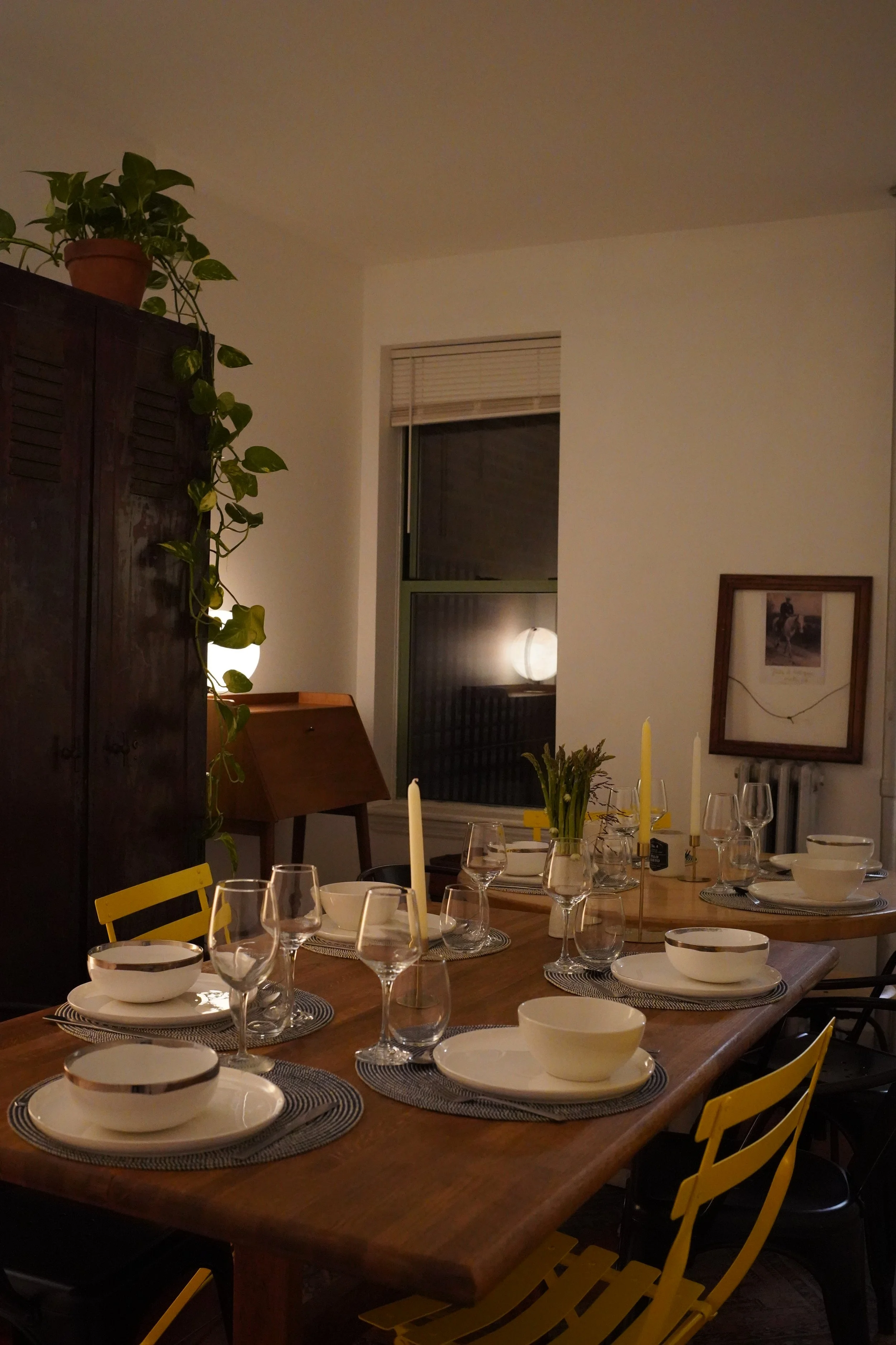 Mid-century farmhouse table from upstate paired with a thick butcher-block dining table from a NJ diner for an eclectic setting